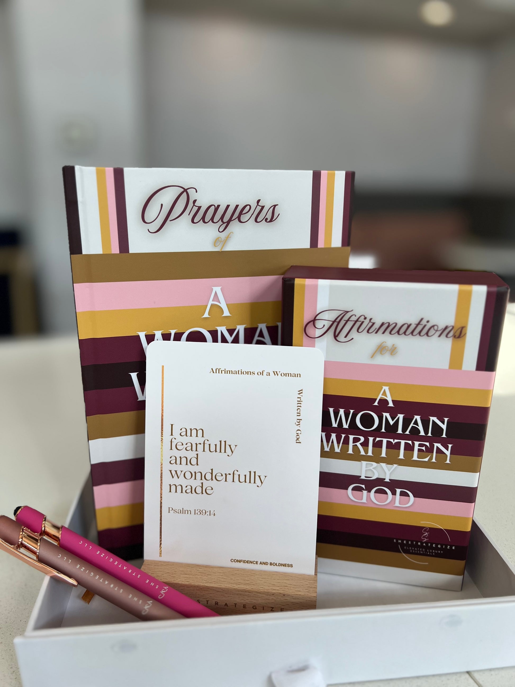The "Affirmations of a Woman Written by God" consist of 100 powerful declarations rooted in scripture to speak life, identity, and boldness into your every day. Designed to reset your mind and remind you of God’s truth wherever you go.