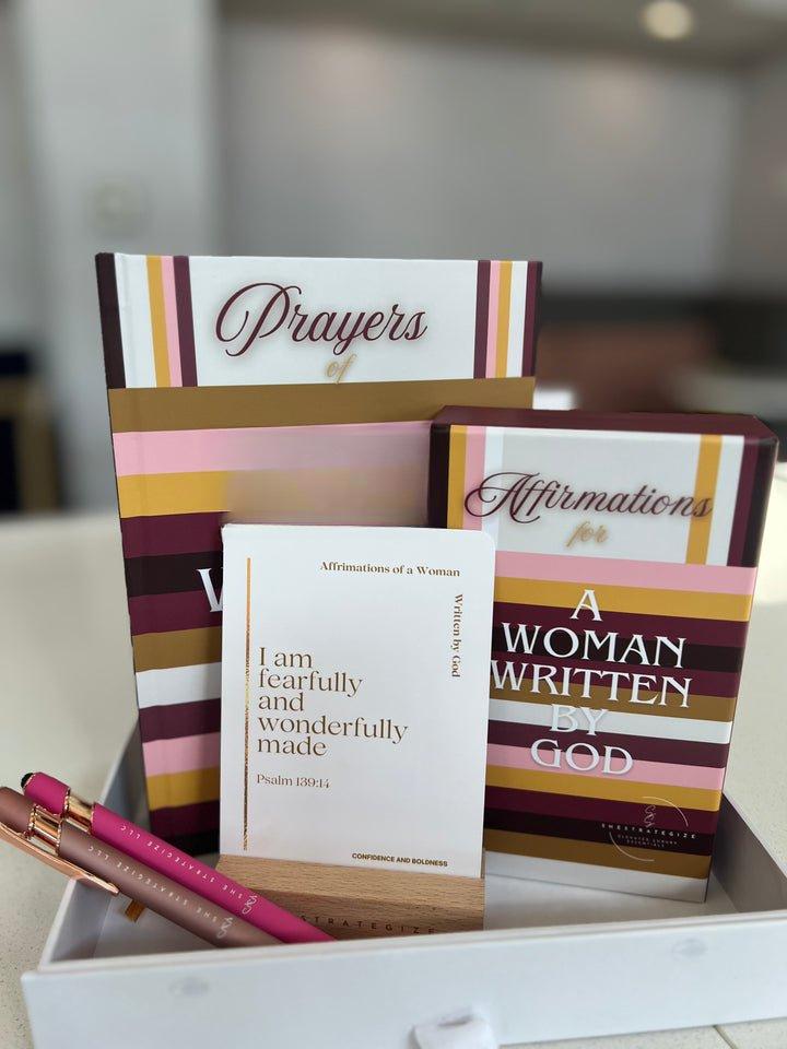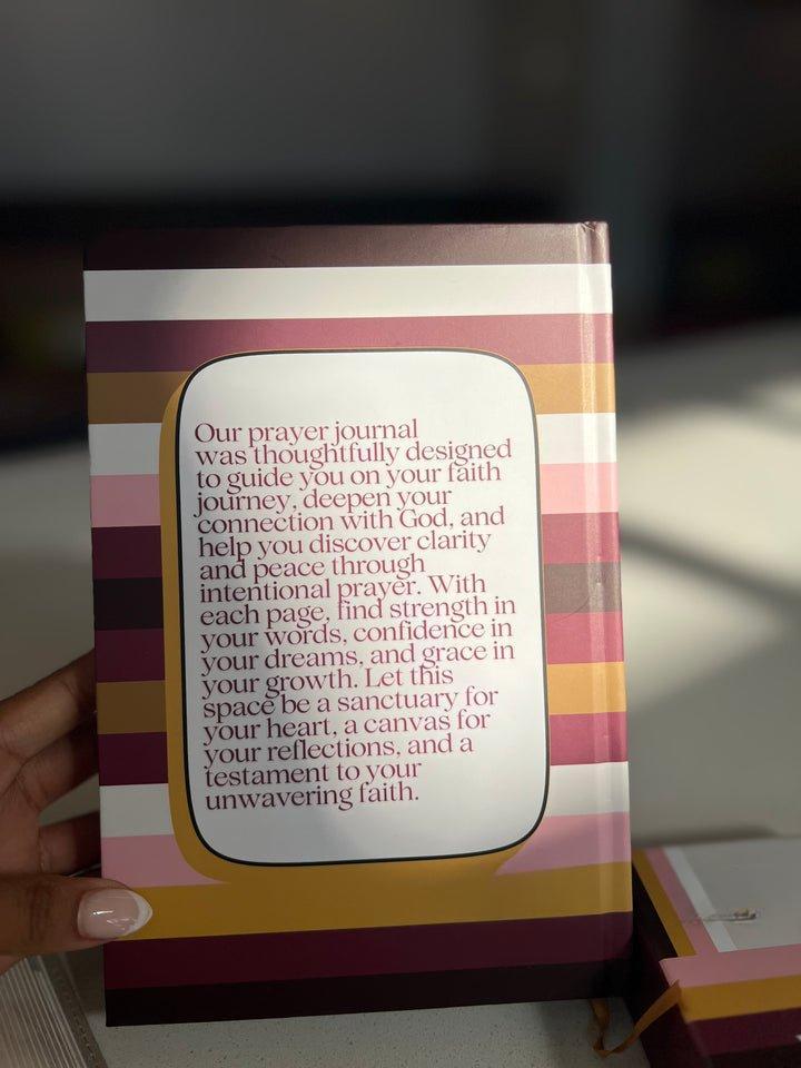 The "Prayers of a Woman Written by God" journal to help you connect deeper with God, organize your prayers, reflect on your growth, and document your prayer journey. Journal includes weekly reflections and writing space for daily prayers.